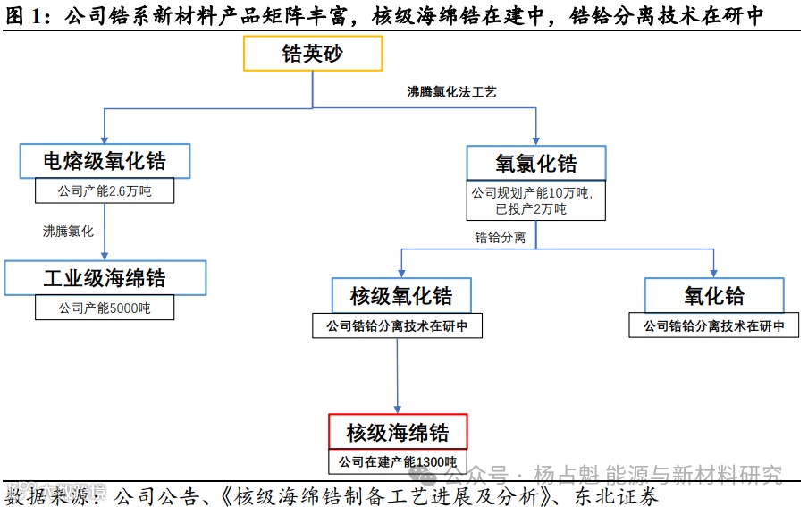 公司锆铪分离技术在研中,有望为核级海绵锆的生产降本;此外,副产的铪或能贡献更大利润。