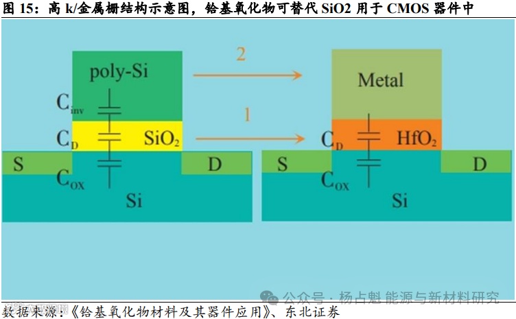 (1)铪基氧化物可替代SiO2用于CMOS器件中。在晶圆制造进入65nm制程及之前,集成电路主要通过沉积SiO2薄膜形成栅极介质减少漏电,但进入45nm制程特别是28nm之后,传统的SiO2栅介质层薄膜材料厚度需缩小至1nm以下,将产生明显的量子隧穿效应和多晶硅耗尽效应,导致漏电流急剧增加,器件性能急剧恶化,已不能满足技术发展的要求。而铪基氧化物等高k氧化物作为栅介质层,可以在降低等效氧化物厚度(EOT)的同时,抑制漏电流的产生。