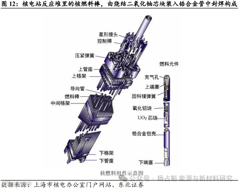 核级海绵锆是制造核级锆合金材料的重要原料,核燃料棒的包壳锆管就是采用核级锆合金材料制造的,具有很好的密封性,以及在核电站运行条件下长期封存裂变产物的能力,是核电站运行的第一道安全屏障。据上海市核电办公室门户网站:以百万千瓦级压水堆核电站为例,通常核反应堆内有157个核燃料组件,每个组件由17×17根燃料棒组成,燃料棒由烧结二氧化铀芯块装入锆合金管中封焊构成,部分燃料组件中有一个控制棒,控制核裂变反应。