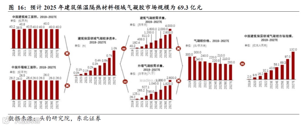 其中,据头豹研究院数据,预计2025年建筑保温隔热材料领域气凝胶市场规模为69.3亿元,同比+19.3%。