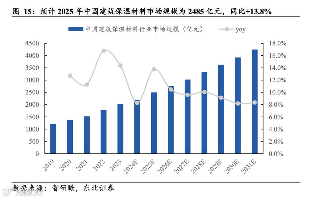 据智研瞻数据,预计2025年中国建筑保温材料市场规模为2485亿元,同比+13.8%,预计2031年将达到4233亿元,同比+8.3%。