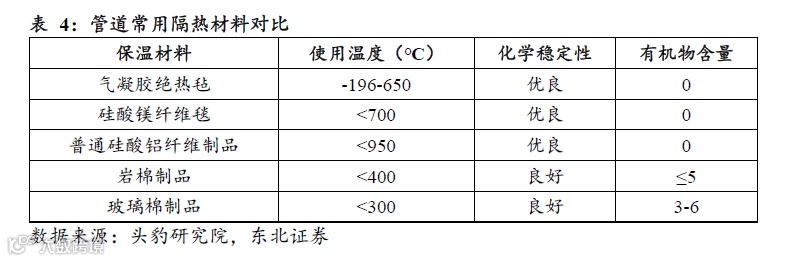 传统的管道保温材料包括硅酸铝、碳酸钙、岩棉等这些材料导热系数较高,为满足国标要求的最大散热损失量需增加材料的厚度,而使用较厚的保温层,对材料的运输、施工、使用空间等都会造成较大影响。气凝胶材料导热系数较低,在同等隔热效果下厚度更薄,可将其用于管道节能技术改造;气凝胶绝热毡与传统保温材料相比寿命更长,传统保温材料寿命在3-5年,而气凝胶材料寿命在10年以上,可大幅减少检修成本;此外,气凝胶绝热毡使用温度在196℃-650℃,与传统保温材料相比使用温度范围更广,更适用于管道节能低碳输送。