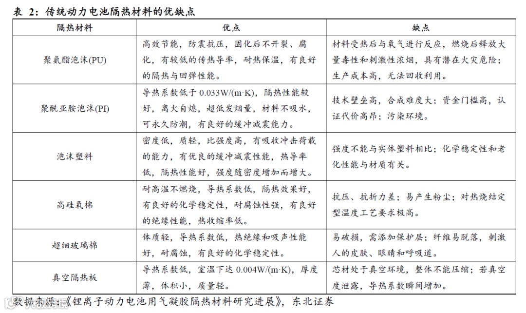 据《锂离子动力电池用气凝胶隔热材料研究进展》,传统的动力电池保温隔热材料有泡棉、泡沫塑料、高硅氧棉、超细玻璃棉、真空隔热板等,可用于动力电池电芯间隔热的泡棉主要有PU、PI泡棉。但存在生产成本高、合成难度大、环境污染、强度弱、易破损等缺点。
