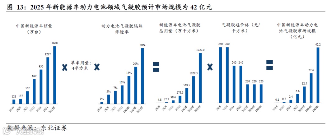 ⑤市场规模:2025年新能源车动力电池领域气凝胶预计市场规模=1920万平方米×220元/平方米=42.2亿元