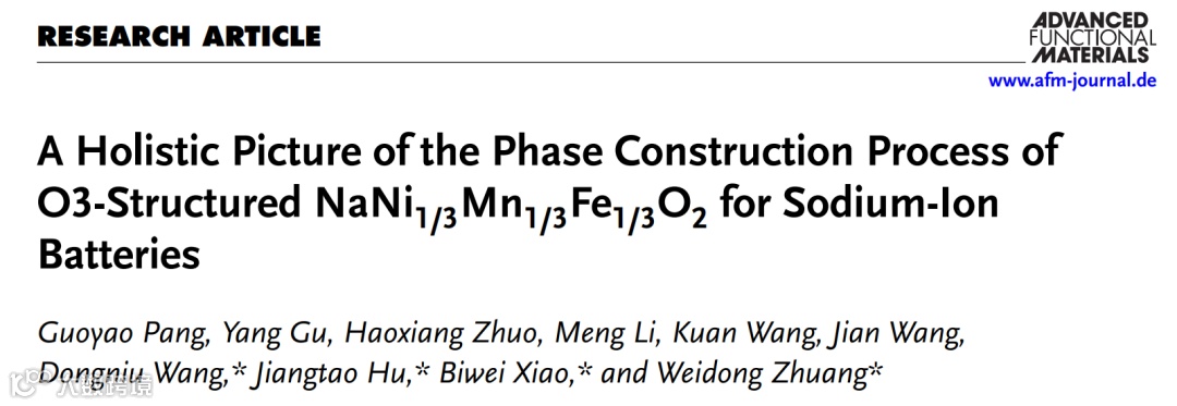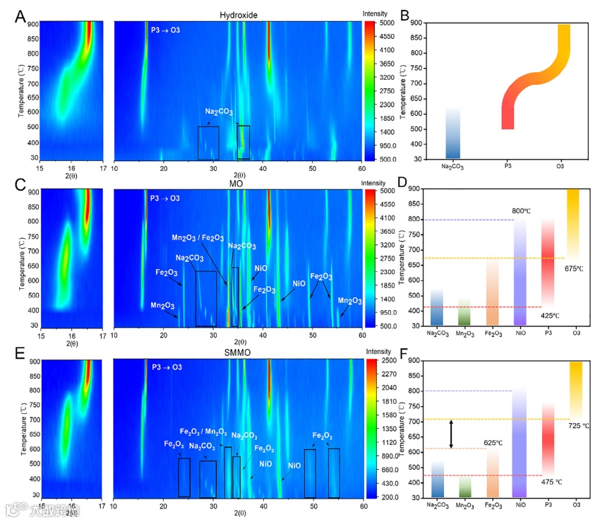 本工作由北京科技大学庞国耀等完成,联合有研(广东)新材料技术研究院、深圳大学、苏州实验室等多个研究机构,系统研究了O3结构NaNi1/3Mn1/3Fe1/3O2在合成过程中的成相机制。通过对比氢氧化物、微米金属氧化物和纳米氧化物三类前驱体,以及Na2CO3、NaOH、NaHCO3三种钠源,揭示了不同路径下的相转变规律,并通过原位XRD和STXM手段分析了扩散和氧化行为对材料结构和性能的影响。