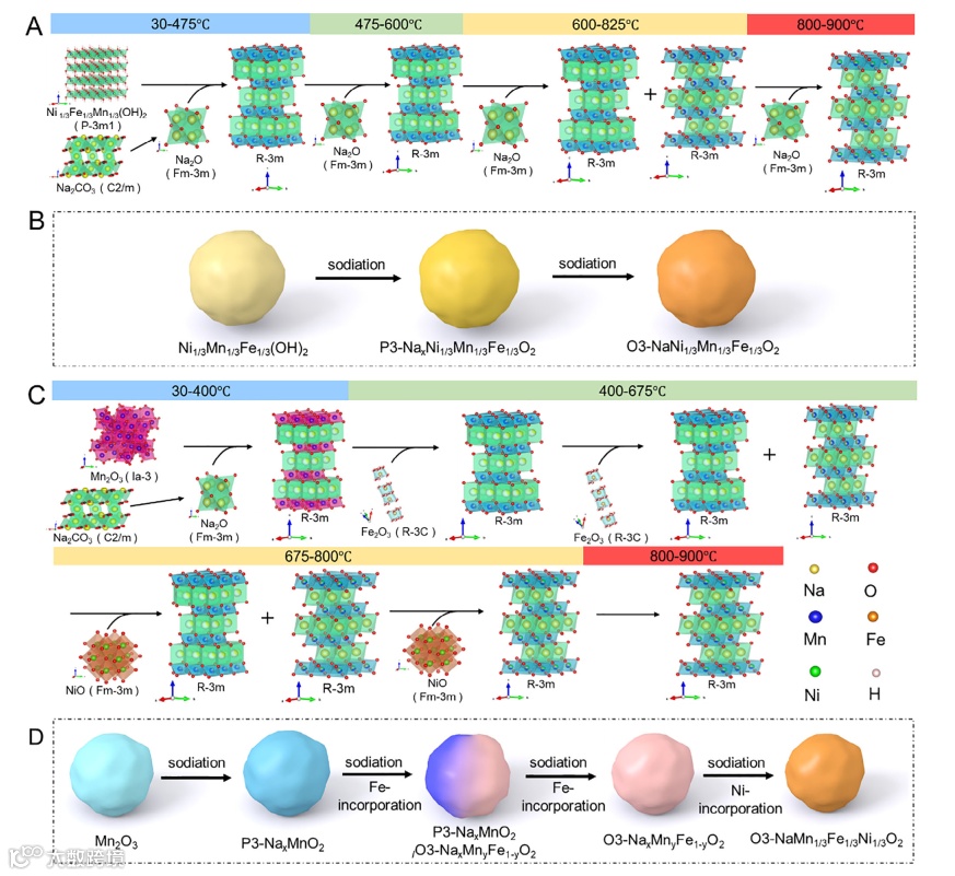 2. 金属氧化物前驱体表现出逐步演化行为,Mn2O3首先形成P3结构,Fe2O3介导O3生成,NiO完成转变,成相前期由钠离子在氧化锰中的扩散决定,后期由Fe、Ni在P3结构中的扩散过程决定。