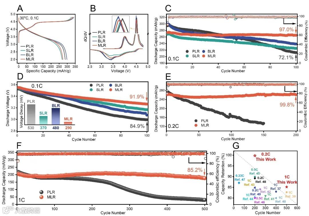 图4 电化学性能对比。(A)PLR、SLR、BLR和MLR材料的首周充放电曲线;(B)相应的dQ/dV曲线;(C)0.1 C倍率下100圈循环的容量保持率(1C = 250 mA/g);(D)0.1 C倍率下100圈循环的平均放电电压曲线;(E)PLR和MLR在0.2 C倍率下200圈循环的容量保持率图;(F)PLR和MLR在1 C倍率下500圈循环的容量保持率图;(G)本工作与已报道富锂锰基正极材料的电化学性能对比。