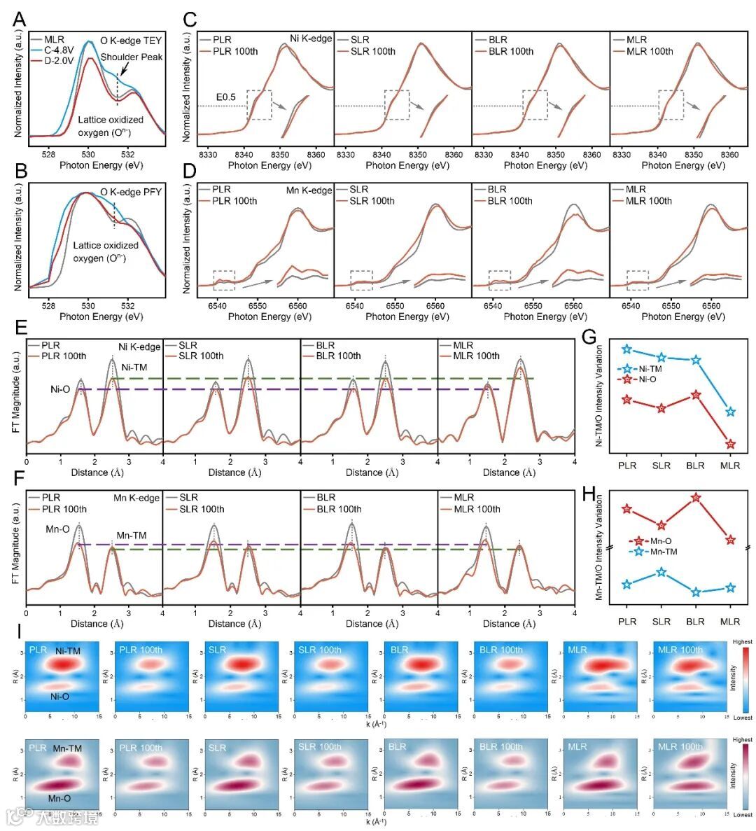 图5 元素价态及局域电子结构的演化。(A)MLR首圈循环中O K边XAS(TEY模式)演化;(B)MLR首圈循环中O K边XAS(PFY模式)演化;(C)PLR、SLR、BLR和MLR在100圈循环前后的Ni K边XANES演化;(D)PLR、SLR、BLR和MLR在100圈循环前后的Mn K边XANES演化;(E)PLR、SLR、BLR和MLR在100圈循环前后的Ni K边EXAFS R空间演化;(F)PLR、SLR、BLR和MLR在100圈循环前后的Mn K边EXAFS R空间演化;(G,H)PLR、SLR、BLR和MLR在100圈循环前后Ni-O、Ni-TM、Mn-O和Mn-TM的EXAFS R空间强度变化;(I)Ni和Mn K边EXAFS R空间信号对应的小波变换图。
