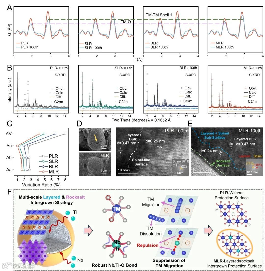图6 MLR的结构演化优势。(A)PLR、SLR、BLR和MLR材料在100圈循环前后的X-ray PDF短程结构对比;(B)四种材料循环100圈后的同步辐射XRD谱图及精修结果;(C)四种材料循环前后晶格参数的变化;(D)PLR和MLR循环后的SEM图像;(E)PLR和MLR材料循环后的HRTEM图像;(F)多尺度层状/岩盐相共生材料的作用机制示意图。