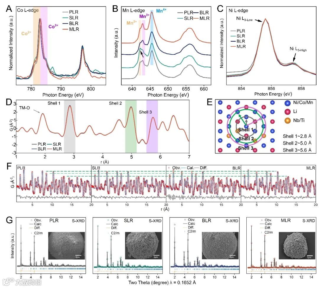 图3 化学态与短程/中程/长程结构表征。(A-C)PLR、SLR、BLR和MLR的Co L边、Mn L边和Ni L边软XAS谱图(TEY模式);(D)PLR、SLR、BLR和MLR的X-ray PDF分析;(E)从X-ray PDF数据获得的短程结构中TM-TM配位的第一壳层、第二壳层和第三壳层的理论宽度及示意图;(F)使用C2/m空间群模型对PLR、SLR、BLR和MLR的X-ray PDF数据进行精修的结果;(G)同步辐射XRD谱图及使用C2/m空间群模型精修结果(插图为四种材料的二次颗粒SEM图像)。
