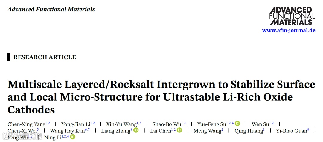近日,北京理工大学的李宁和苏岳锋教授团队在国际知名期刊Advanced Functional Materials上发表题为“Multiscale Layered/Rocksalt Intergrown to Stabilize Surface and Local Micro‐Structure for Ultrastable Li‐Rich Oxide Cathodes”的研究工作。该研究提出了一种新颖的“多尺度层状/岩盐相共生”(Multiscale Layered/Rocksalt Intergrown)策略,通过同时利用d⁰过渡金属离子Nb⁵⁺和Ti⁴⁺在高温煅烧过程中的不同扩散深度,在富锂锰基正极材料的表面和体相分别构建层状/岩盐相共生异质结构,从而实现对材料从表面到体相的全方位结构稳定化。