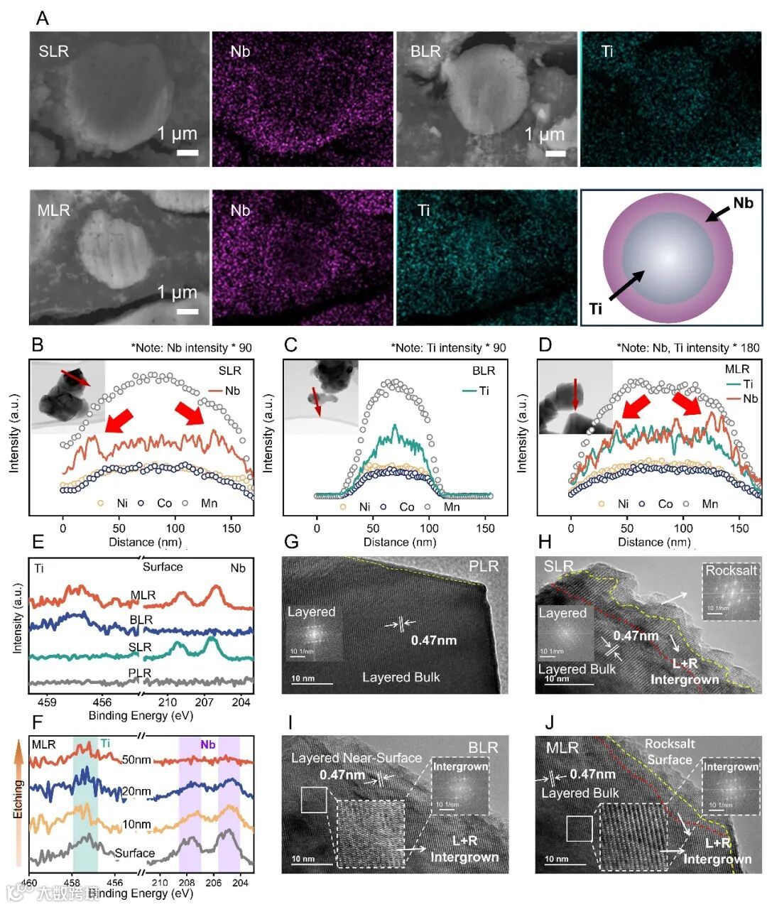图2 MLR结构及元素分布验证。(A)SLR、BLR和MLR材料中二次颗粒的截面SEM-EDS面扫图;(B-D)SLR、BLR和MLR样品中Ni、Co、Mn及Nb/Ti元素的TEM线扫图;(E)PLR、SLR、BLR和MLR材料中Nb和Ti元素的XPS谱图;(F)MLR材料中不同刻蚀深度下Nb和Ti的XPS谱图;(G-J)PLR、SLR、BLR和MLR材料的HRTEM图及相应的FFT图