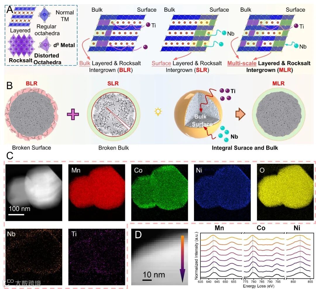 图1. 多尺度层状/岩盐共生结构的构筑。(A)利用d⁰过渡金属适应岩盐结构中晶格畸变、促进局部岩盐相形成的方法示意图。通过选择性地控制不同d⁰过渡金属的扩散深度,实现多尺度上层状/岩盐相共生;(B)BLR、SLR和MLR材料在不同尺度上层状/岩盐相共生结构循环后的结构完整性示意图;(C)MLR材料的TEM-EDS图像;(D)MLR材料从表面到体相的Mn、Co和Ni价态演变的EELS分析