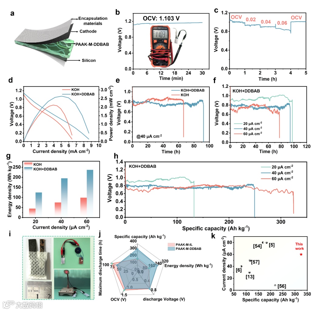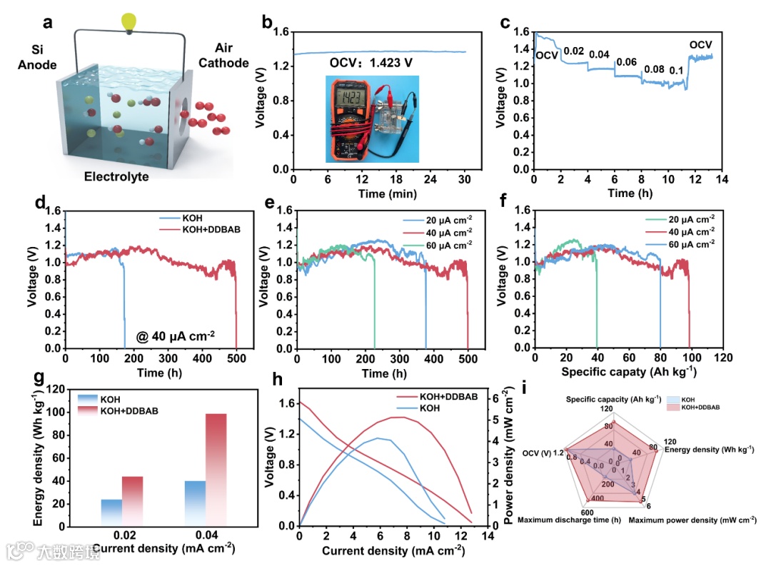 从热力学角度看,OH⁻在内亥姆霍兹层(IHL)优先与硅形成强而稳定的Si-O化学键,而H2O仅物理吸附于外层,从而形成了原始的双电层(EDL)结构。基于这些基础研究,我们设计了一种极性DDBAB添加剂,用于在硅阳极表面原位构建疏水保护层。十二烷基二甲基苄基溴化铵(DDBAB)的阳离子组分((C2H5)2N+(C6H5)2)通过静电作用吸附于OH⁻外层,取代了IHL中大部分H2O分子。DDBAB阳离子中的苯环(C6H5)和乙基(C2H5)具有疏水性,从而在硅电极表面形成原位疏水保护层。该疏水屏障能有效阻隔活性水分子接触硅/电解质界面,既降低了腐蚀反应速率,又提高了析氢反应(HER)的能垒。DDBAB的另一优势在于其与硅阳极的结合能对温度不敏感,使其能在宽温域条件下保持优异的保护效果。在高低温度条件下均表现出优异的保护效果。实验验证表明,硅阳极在碱性电解质中的析氢腐蚀速率从180 ppm显著降低至1.30 ppm,腐蚀抑制效率高达99.36%。硅-空气电池的放电时间从173小时延长至500小时,电池寿命提升2.9倍,同时能量密度和比容量分别提高2.6倍和2.7倍。本研究成功解决了制约硅-空气电池实际应用的阳极腐蚀关键问题,为其未来发展奠定了坚实的技术基础。