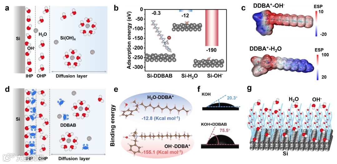 硅阳极腐蚀反应(Si + 2OH⁻ + 2H2O → SiO2(OH)22⁻ + 2H2)的核心在于H2O的参与。由于Si-OH⁻的吸附能(-190 kcal mol-1)显著高于Si-H₂O(-12 kcal mol-1),OH⁻倾向于在内亥姆霍兹层(IHL)形成强而稳定的Si-O化学键,而溶剂H₂O仅物理吸附于OH⁻外层。初始双电层(EDL)结构如图1a所示。引入DDBAB添加剂后,通过XPS和FTIR测试证实了原位疏水性保护层的存在。此外通过DFT)计算表明,Si-OH⁻的吸附能(-190 kcal mol-1)显著高于Si-H2O(-12 kcal mol-1)和Si-DDBAB(-0.3 kcal mol-1)(图1b)。静电势(ESP)分析(图1c)显示,DDBA+((C2H5)2N+(C6H5)2)与OH-之间存在强静电吸引作用(蓝色负电势区域),而与H2O的相互作用较弱(红色正电势区域)。量子化学计算(图1e)进一步证实,DDBA+与OH⁻的结合能(-155.1 kcal mol-1)远高于其与H₂O的结合能(-12.8 kcal mol-1)。这表明DDBAB虽不能直接优先吸附于硅阳极表面(OH⁻仍保持优先吸附),但凭借其与OH⁻的强静电作用和更高结合能,DDBA+可优先吸附于Si-OH⁻外层,取代内亥姆霍兹层(IHL)中的H2O(图1d)。这一重构显著减少了H2O与硅阳极的接触,从而有效抑制了由H2O引发的析氢腐蚀。