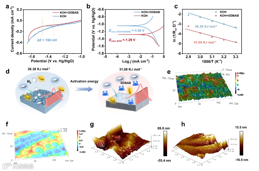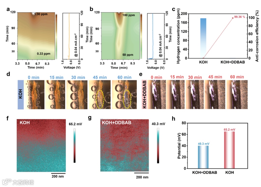 原位电化学气相色谱、原位光学显微镜及开尔文探针测试结果表明,DDBAB添加剂改变了原始EDL,形成了有效的原位疏水保护层,从而显著抑制了直接H2O诱发的腐蚀。