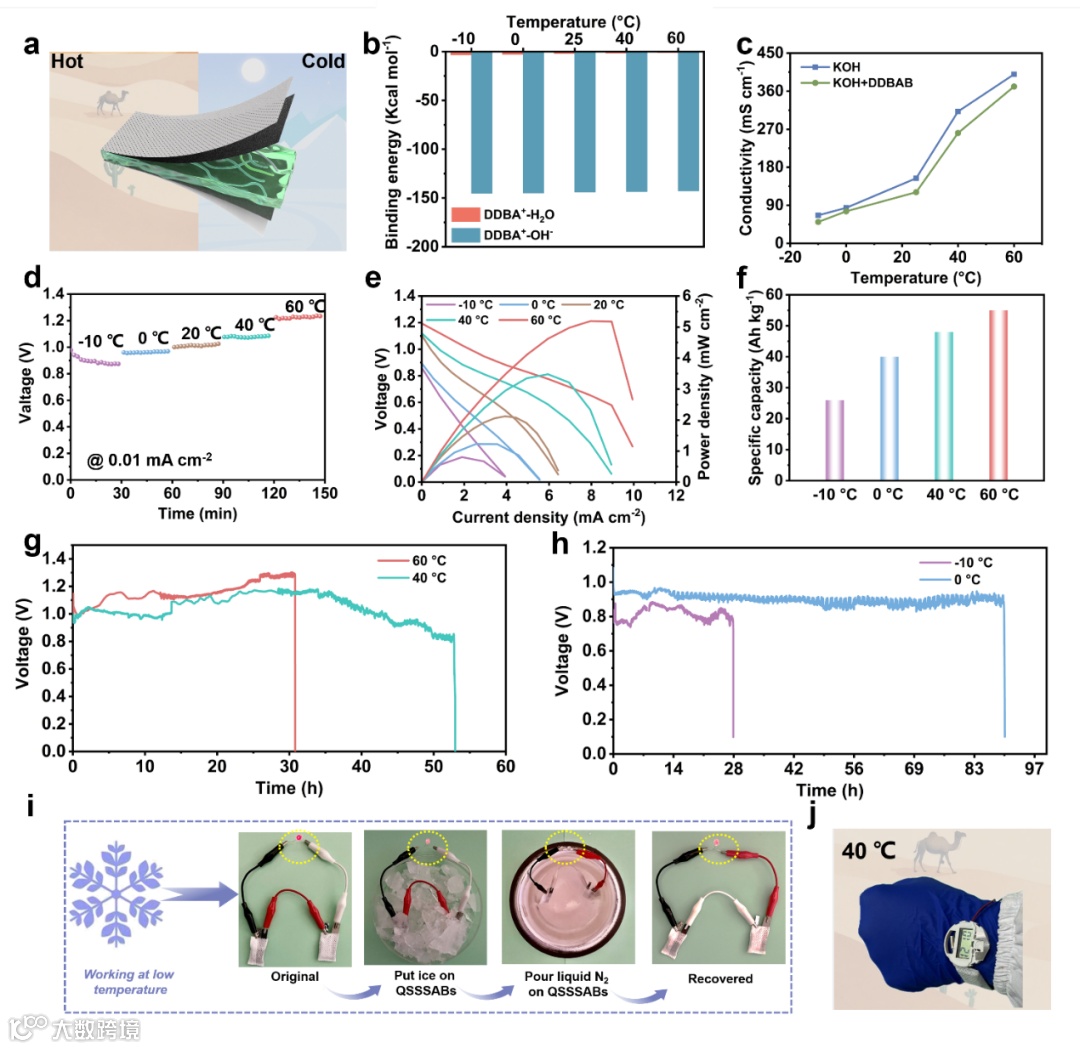 为了进一步评估QSSSABs在较宽温度范围内的应用潜力,在10至60°C范围内测试了它们的温度容差。首先,研究了DDBAB在较宽温度范围内的吸附特性。计算结果表明,在10至60°C的温度范围内,DDBA+-OH-的结合能保持不变,这表明该系统在该温度范围内表现出高的热稳定性。此外,测量了KOH和KOH + DDBAB凝胶电解质的离子电导率。KOH+DDBAB系统在低温区(< 0°C)保持与KOH相似的电导率。虽然两个系统在高温(> 40°C)下都显示出高电导率,但值得注意的是,KOH+DDBAB显示出较小的波动。这些结果表明KOH+DDBAB体系具有很强的温度适应性。因此,QSSSABs在-10~60℃内表现出良好的放电性能,QSSSAB在60°C时达到5.18 mW cm-2的最大功率密度,同时在60°C时保持1.2 V的稳定放电电压和31 h的放电持续时间。QSSSAB在0°C时保持0.95 V的放电电压和85 h的放电持续时间。该电池的最高比容量为53 Ah·kg-1。QSSSABs在宽温度范围内具有出色的应用潜力:两节串联电池成功地为一个LED供电。当冰放在电池表面时,它继续稳定运行。当完全浸入液氮中时,凝胶电解质瞬间凝固,导致LED关闭。过了一小段时间后,电池恢复,并继续为LED供电。