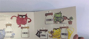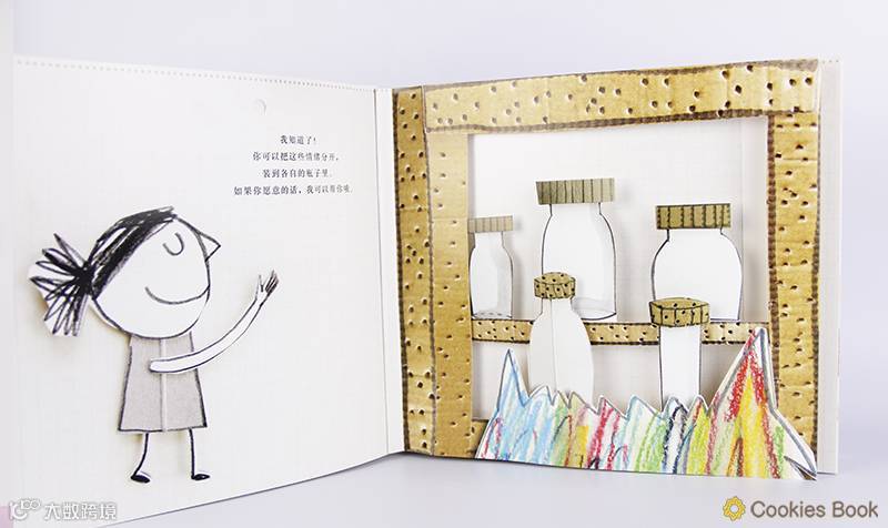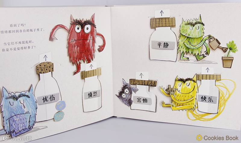 就去向朋友小女孩求助,小女孩建议它把各种情绪分开。并加以管理,放进不同的瓶子里(这个情绪瓶子惊艳到我,太棒的构思!),于是他就变成了不同颜色的小怪兽。