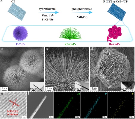 通过简单的水热及后续磷化两步制备了F-CoPv/CP复合材料。F掺杂诱导了分散良好的纳米棒结构,进一步组装成类蒲公英状微球结构。