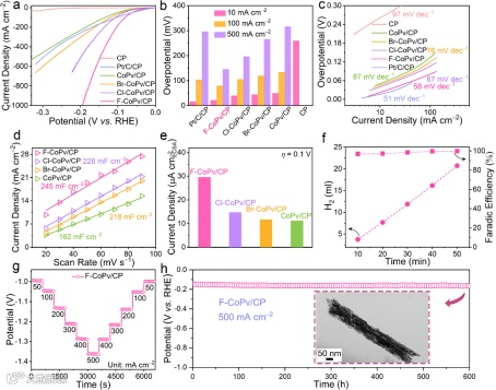 图4. F-CoPv/CP复合材料的HER性能。