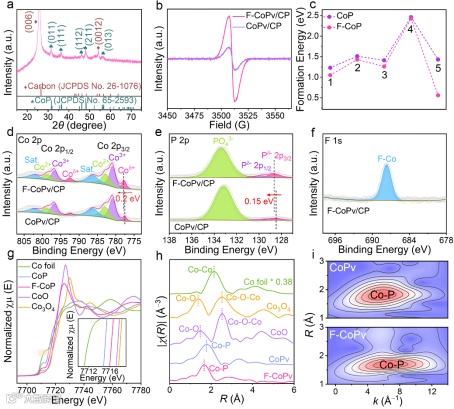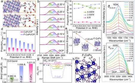 F掺杂降低了P空位的形成能垒,确保了掺杂和空位同时产生。P空位暴露出配位不饱和的Co活性位点,而相邻的F原子通过F···H-O键打破了刚性的氢键网络,有效地调节了界面水结构。
