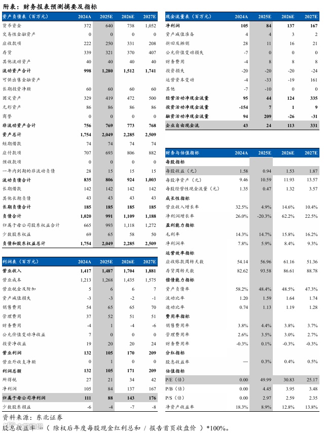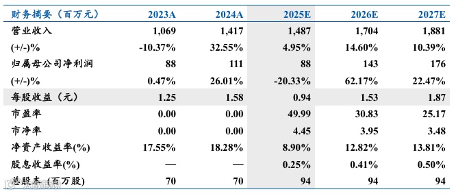 我们预计2025-2027年公司实现归母净利润0.88/1.43/1.76亿元,对应PE为49.99X/30.83X/25.17X,首次覆盖,予以“增持”评级。