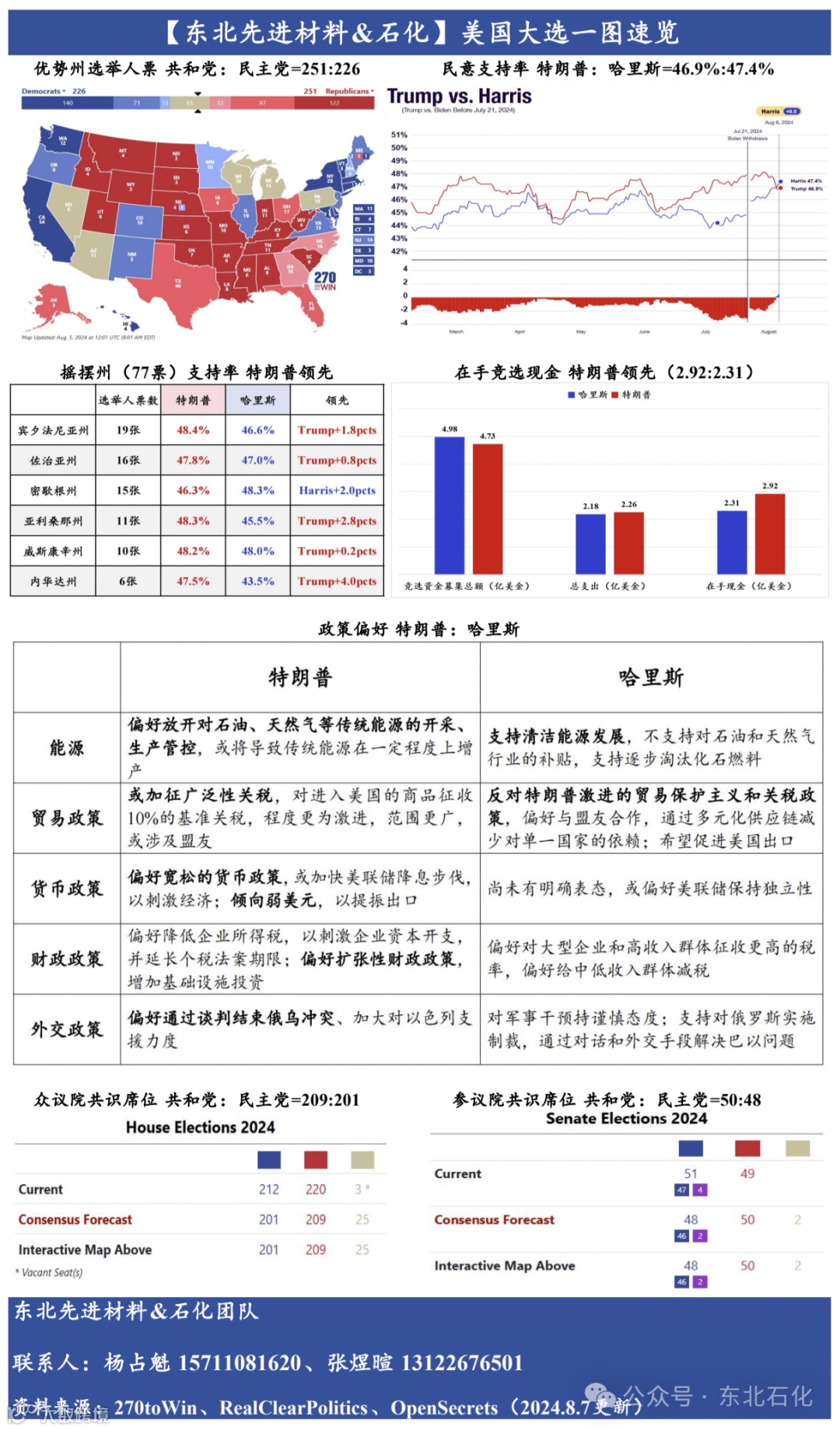 民调支持率:据Real Clear Politics,截至8月6日,特朗普:哈里斯=46.9%:47.4%,哈里斯民调支持率优势扩大;