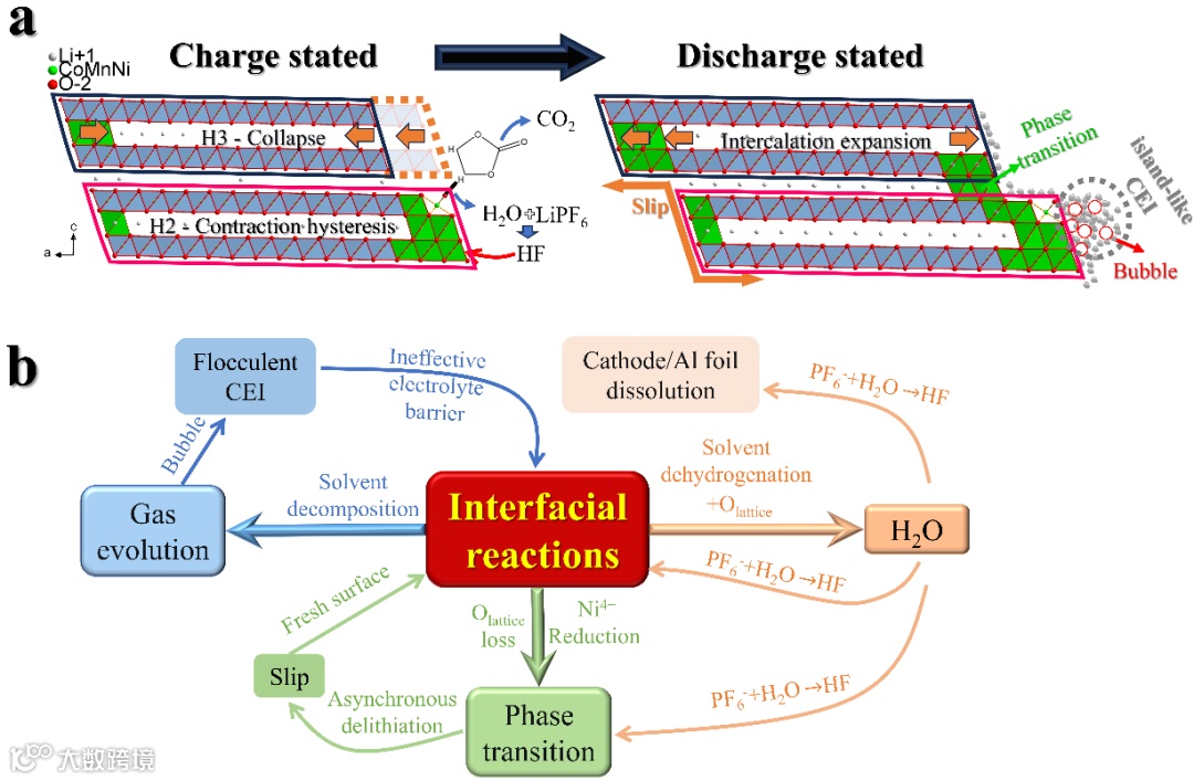 锂离子电池高镍正极材料单晶化被认为是提高高镍正极稳定性的有效方法。然而,实际中制备出兼具单晶形貌和良好电化学性能的高镍单晶正极是非常具有挑战性的。通常制备的单晶正极相比于多晶出现了容量降低、倍率下降、滑移等现象,且循环稳定性并不一定具有优势。目前,对高镍单晶正极材料的衰减机制认识并不清晰,例如究竟是滑移、相变或金属离子溶解主导尚有争议。同时对于滑移这一重要衰减因素的动力学产生机制,理解还不够深入,它常被笼统的归因于Li的浓度梯度。单晶衰减机制的理解不足增加了产业上的试错成本。此外,根据综合电解液领域的研究,经常会发现即使是使用相同的正极材料,电解液成分改变也会导致正极表面相变、金属离子溶解和颗粒破裂等方面的显著差异。还有研究表明,高镍正极表面产生的氧物种会氧化碳酸脂溶剂,生成酸性副产物,这为理解正极材料的结构衰退提供了新的思路。这些结果表明,发生在正极材料上的不良现象不一定完全由材料体相变化决定,正极材料/电解液界面会在正极材料的降解过程中起着至关重要的作用。