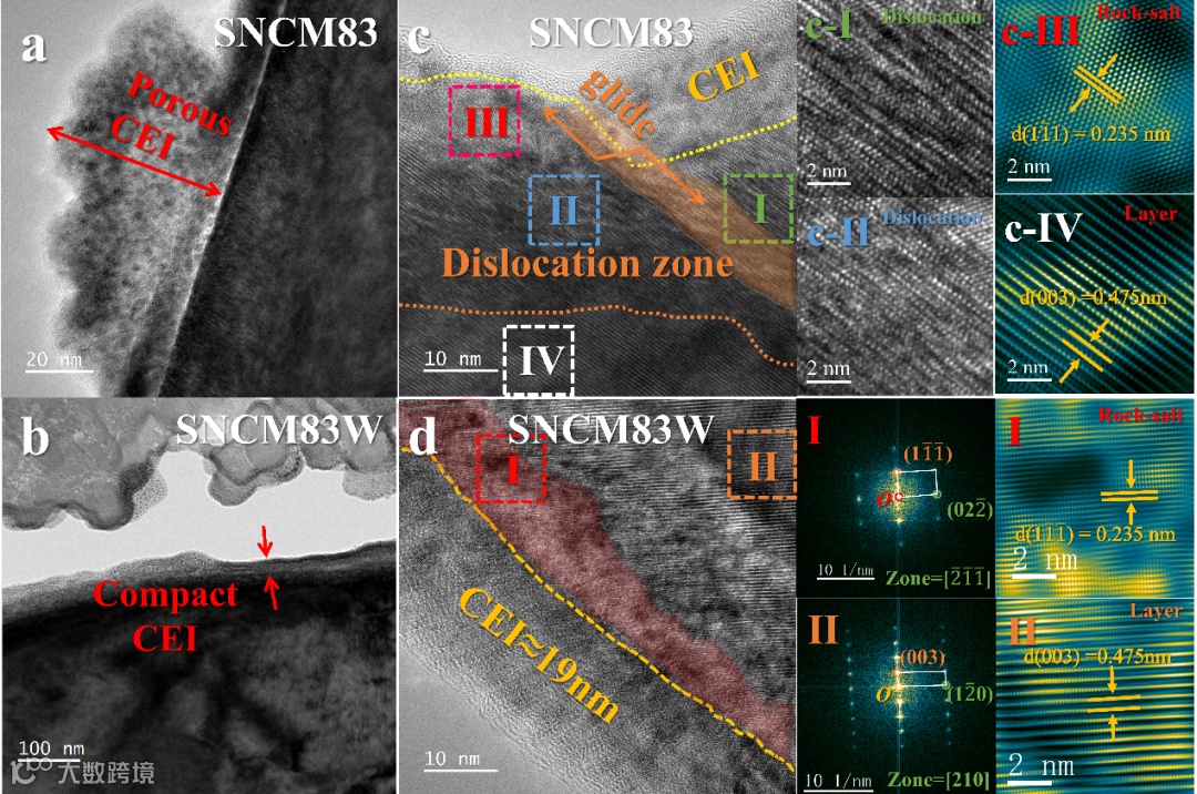 颗粒表面状态会显著影响CEI形貌和组分。表面处理前形成厚的颗粒状多孔的CEI,发生单晶的滑移,且滑移区附近存在大量的层错,层错暴露的新鲜表面转变为盐岩相。而表面处理后CEI致密且均匀,晶格周期性良好,仅薄的一层相变。