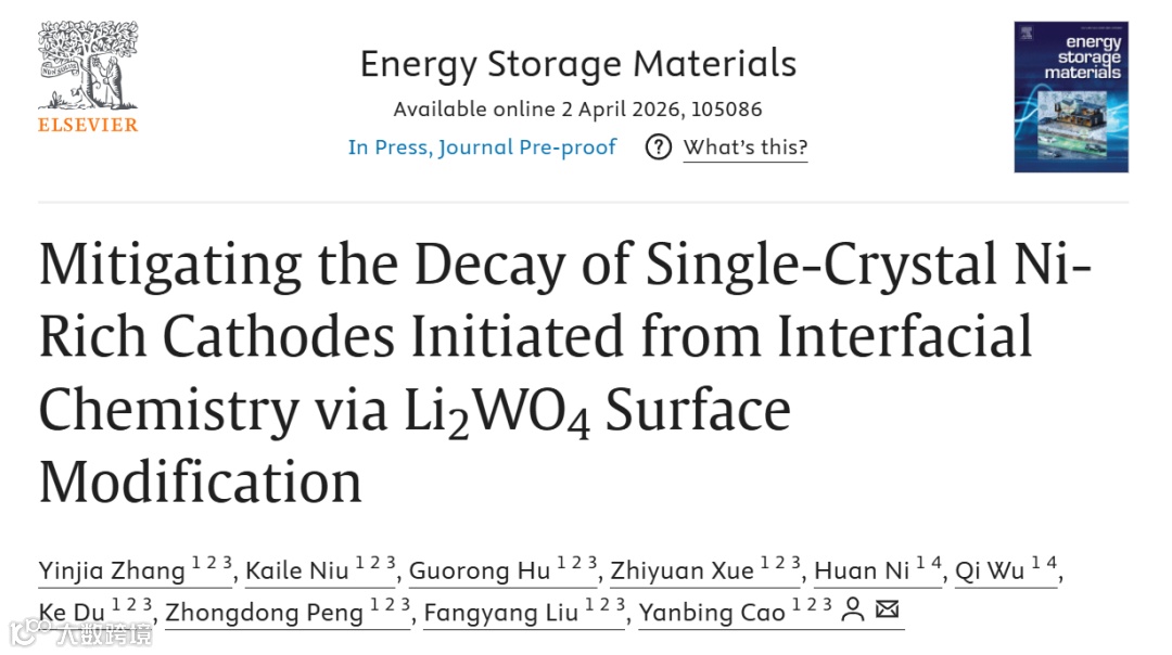 Li2WO4表面修饰单晶高镍正极:缓解始于界面化学的衰减