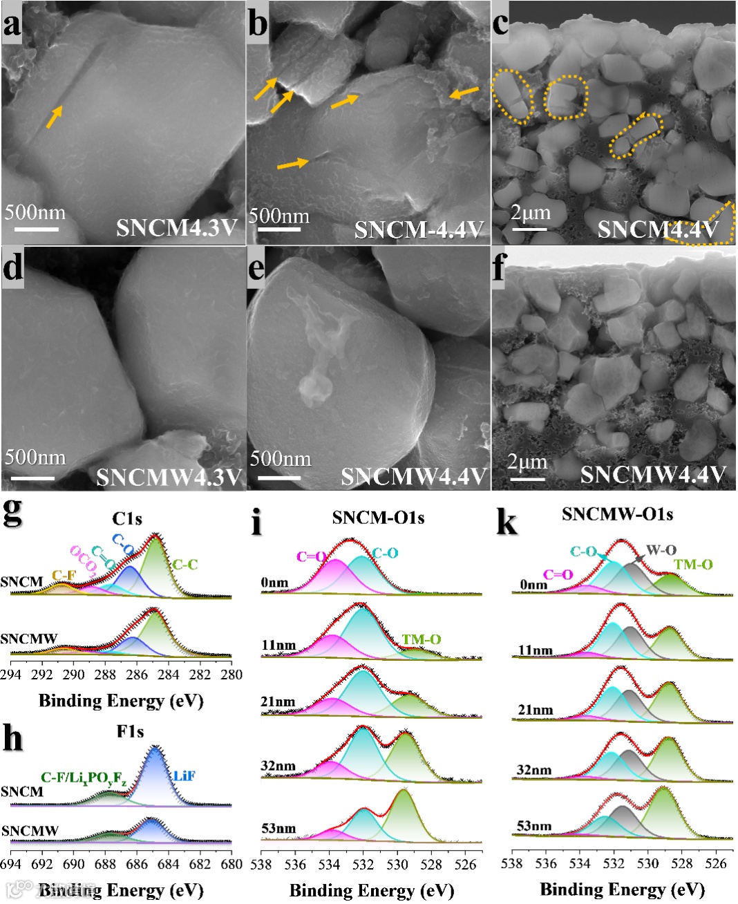 DEMS显示WO3表面处理后CO2(正极侧界面副反应量化指标) 产气量仅为包覆前的一半,且未进行表面处理的材料在4.3V左右O2产生后CO2产气激增,验证了表面处理后显著缓解了界面副反应,反映了表面处理后高电压下界面稳定性增强。