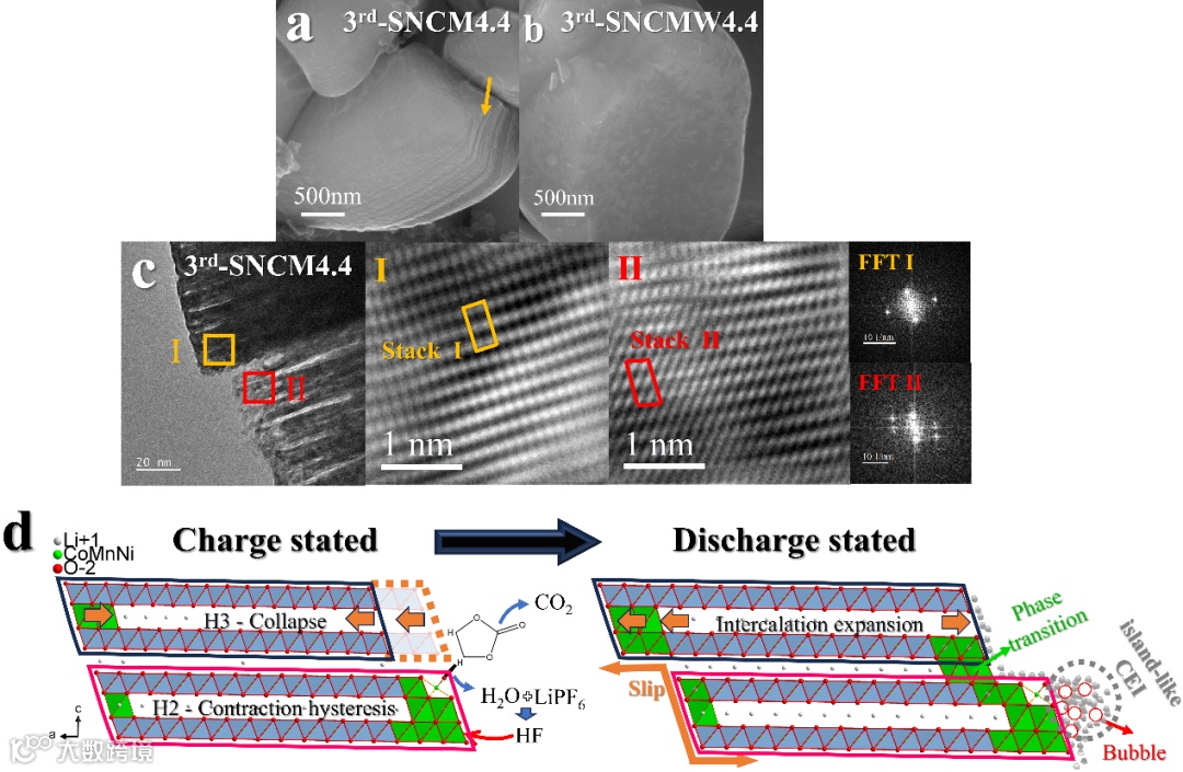 包覆前单晶颗粒循环后表面产生大量颗粒状副产物,而表面处理后即使在4.4V循环表面是干净的,说明包覆修饰层抑制了界面副反应。重要的是未进行表面修饰的材料在4.4V循环后产生了明显的滑移和层状解离,说明了表面修饰后更大的晶格应变并不是导致晶内裂纹产生的主导因素,而是单晶内部的脱锂不均匀引起的相间晶格参数失配引起的(H2与H3相共存)。
