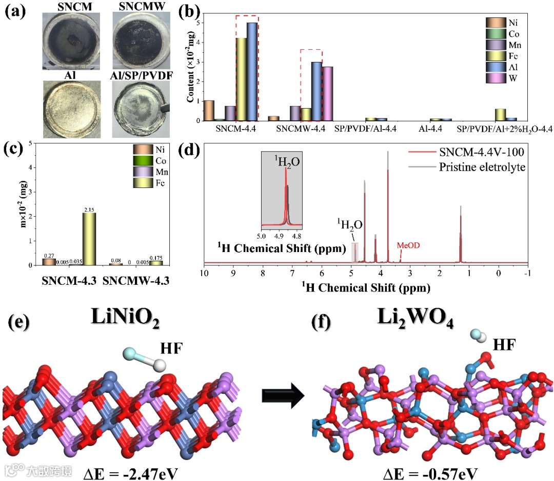 当正极材料从正极极片中剔除后,循环后的 Al箔和正极壳溶解几乎可忽略,且即使在电解液中添加2vol%H2O也远低于正极材料存在时的腐蚀情况,说明电池中痕量水不是腐蚀的根源,而是在电化学循环中高镍正极/电解液界面持续副反应产生的H2O是主要因素。