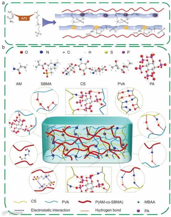 化学交联的两性离子共聚物[P(AM-co-SBMA)]以APS为自由基聚合引发剂,MBAA为交联剂构建了初级多孔骨架。APS产生的自由基可以裂解AM和SBMA单体的C=C双键,生成两性离子共聚物。SBMA中的带电官能团和共聚物链中的极性官能团通过静电相互作用促进K+和OH−离子的传输,离子高速传输通道如图2a所示。同时,共聚物链之间存在交联,这有助于MBAA化学交联剂的协同作用以及两性离子SBMA中−NH2+−和−SO3−带电官能团之间的静电相互作用。此外,PA、PVA、CS和[P(AM-co-SBMA)]之间丰富的物理交联通过羟基键相互作用建立了次生多孔骨架,包括PVA中的−OH、CS中的−OH和−COOH、PA中的−OH和−P =O以及AM中的−NH2基团。水凝胶的相关交联机理如图2b所示,形成的三维连通多级孔微观形貌如图3所示。