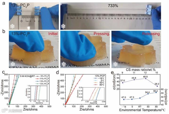 图4 13%-PC2P水凝胶 (a) 拉伸照片, (b) −24℃冷冻24h后自恢复照片. 不同CS含量PC2P水凝胶 (c) 室温和 (d) 不同温度Nyquist 曲线. (e) 不同CS含量PC2P水凝胶室温离子电导率和13%-PC2P水凝胶 不同温度下的离子电导率。