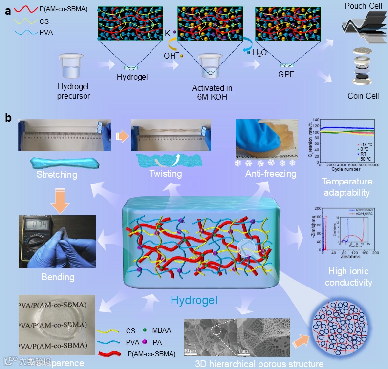 图1. 水凝胶聚合物电解质、微观形貌及性能示意图。
