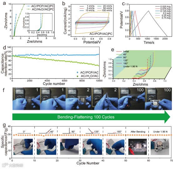 AC//PCP//AC|PC和AC//H2O//AC|PC在0.5 A/g下循环10,000次后,电容保持率分别达到107%和56.2%(图6d),表明AC//PCP//AC|PC与AC//H2O//AC|PC相比,具有更好的容量和循环稳定性。三个PCP袋装SCs串联在一起可以点亮一个红色LED灯泡,证明了其实际应用的可行性(Video 1)。为了评估AC//PCP//AC|PC的界面稳定性,在不同的弯曲角度和1.96 N的压力下进行了EIS测试(图6e),可以观察到,在奈奎斯特曲线几乎无明显变化,这意味着在多次弯曲循环后,袋式器件中的电极-电解质界面没有发生分层。为了进一步表征抗弯性能,进行了100次连续180°弯曲实验(图5f)。开路电位保持稳定在0.74 V,在100次循环结束时略有下降至0.73 V。在不同弯曲角度和垂直力为1.96 N的条件下,对AC//PCP//AC|PC经过100次弯曲后的GCD曲线进行了重新评价,AC//PCP//AC|PC经过各种弯曲和挤压后的Cs仍达到120.8 F/g(图5g),进一步证明了电极与GPE之间的界面接触良好。为了进一步评估AC//PCP//AC|PC的抗压极限,用总质量为1587 kg的汽车碾过将该器件(Video 2),碾压前后的开路电位无明显变化,经过5次连续碾压循环后,电压从0.66 V降至0.48 V。柔性袋SC可承受至少100次180°弯曲循环(图6f),并能承受碾过它的汽车的重量之后,在2 A/g的电流密度下,100,000次循环后仍保持99%的容量(图6h)。
