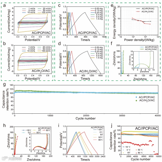 图5 AC//H2O//AC 和AC//PCP//AC器件的 (a,b) CV曲线, (c,d) GCD 曲线, (e) Rargon 图, (f) Nyquist 曲线和 (g) 循环稳定性. AC//PCP//AC在不同温度下的(h) Nyquist 曲线, (i) 0.05 A/g下的GCD曲线, (j) 在0.5 A/g 和 不同温度下的循环稳定性。