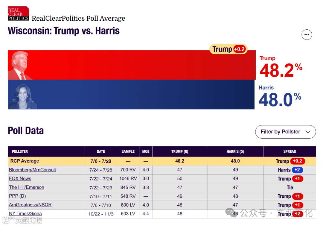 据Real Clear Politics, 截至8月1日,在威斯康辛州(10张选举人票),两人民调支持率或已接近。