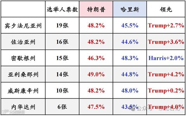 在摇摆州,特朗普整体仍保持优势,但与哈里斯差距缩小。