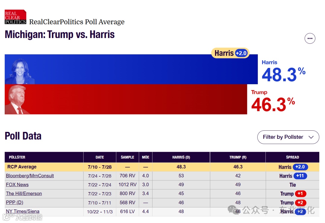据Real Clear Politics, 截至8月1日,在密歇根州(15张选举人票),哈里斯民调支持率或反超特朗普。