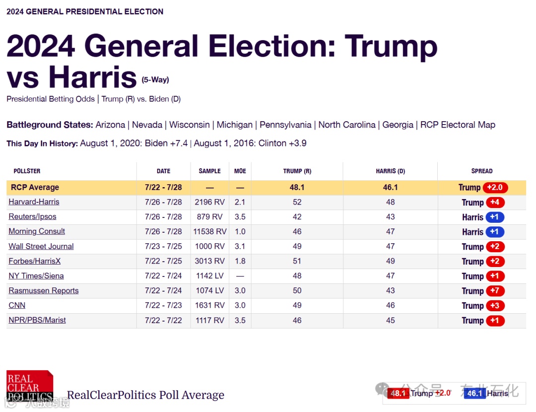 据Real Clear Politics, 截至8月1日,哈里斯的整体民调支持率提升至46.1%,虽落后于特朗普的48.1%,但在个别民调中(Reuters/Ipsos、Morning Consult),支持率或反超特朗普。