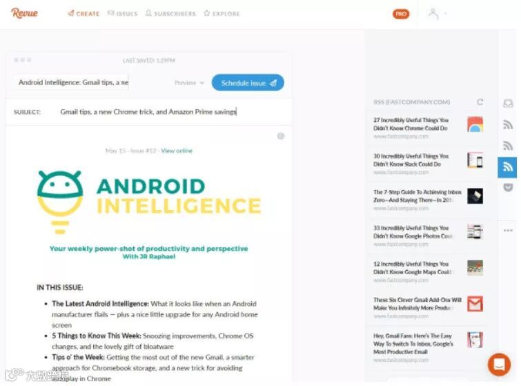 Revue基于web的编辑界面非常简单:你只需要粘贴文章、推文甚至YouTube视频的链接,然后添加任何你想要的文本和图像,系统就会为你设置所有内容的格式。你甚至可以连接不同类型的订阅源或使用Revue的Chrome扩展来保存整天的内容,然后让它把这些内容拖放到适当位置。
