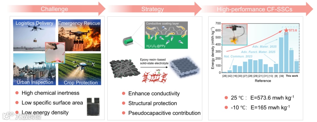 随着低空经济的快速发展,尤其是无人机与电动飞行器的广泛应用,系统对续航能力与载荷能力的协同提升提出了更高要求。传统“结构—储能分离”模式中,结构件不参与储能且质量占比较大,严重限制了整体能量密度。碳纤维结构超级电容器(CF-SSCs)通过将储能功能与承载结构一体化,有望实现轻量化与高效能的统一。然而,碳纤维本身化学惰性强,界面活性位点有限,导致器件比电容偏低。同时,实际应用环境复杂多变,低温条件作为典型极端环境之一,对器件性能提出了更高要求。因此,研究兼具高倍率性能与低温适应性的CF-SSC体系,对于推动其在极端环境下的工程应用具有重要意义。