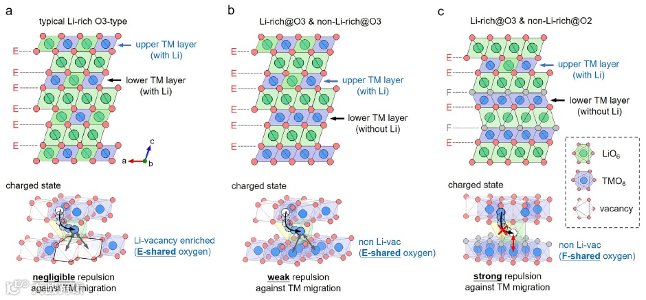 界面面共享构型不仅直接抑制了过渡金属的面外迁移,还减少了过渡金属层中的空位数量。空位的减少进一步抑制了过渡金属的“面内迁移”和“空位团簇”的形成,从而切断了导致氧失稳和结构畸变的连锁反应,显著提升了锂离子脱嵌/回嵌的可逆性和晶格氧的稳定性。