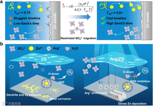 图1. (a)Sand时间模型示意图;(b)在初始ZS电解液和精氨酸改性ZS电解液中,锌电极-电解液界面处的锌沉积行为示意图。