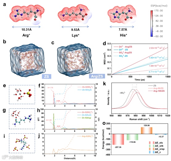 图2. (a)Arg+, Lys+, His+的静电势与分子尺寸;(b)ZS体系和(c)Arg-50/ZS体系的分子动力学模拟快照;(d)两种电解液中锌离子和硫酸根离子的均方位移;(e,f)ZS 以及(g-j)Arg-50/ZS 的分子动力学模拟快照、径向分布函数和配位数;(k)不同电解液在980 cm−1附近的拉曼光谱位移;(o)Arg+与SO42−相互作用的能量分解分析结果。