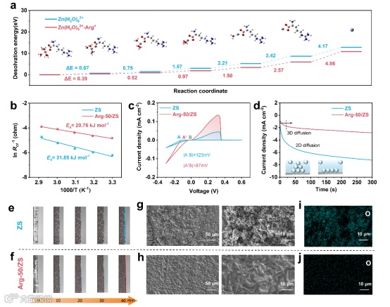 图5.(a)Zn(H2O)52+-Arg+和Zn(H2O)62+的逐步去溶剂化能;(b)Zn//Zn电池在不同电解液中的活化能;(c)Zn//Cu电池的循环伏安曲线;(d)Zn//Zn电池的计时电流曲线;(e,f)不同电解液中锌沉积的原位光学图像;(g,h)循环后锌阳极的扫描电镜图像;(i,j)循环后锌阳极上O元素对应的EDS面分布图。