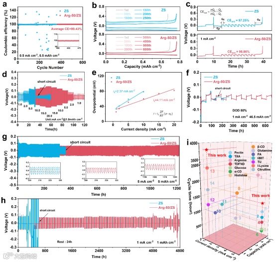 图6. (a)Zn//Cu非对称电池的库仑效率及(b)相应的电压-容量曲线;(c)用于评估平均锌沉积/剥离库仑效率的“储库半电池”方法;(d)ZS和Arg-50/ZS电解液中的倍率性能及(e)相应的交换电流密度曲线;(f)80%放电深度下的循环稳定性;(g)5 mA cm−2电流密度和5 mAh cm−2容量下的循环性能;(h)Zn//Zn对称电池在锌剥离/沉积循环与静置(24小时)交替进行下的动态测试;(i)本研究与近期相关研究的性能对比分析。