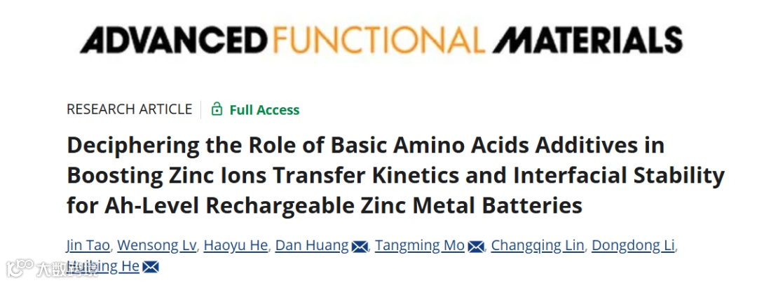 近日,来自广西大学的何会兵教授、莫唐明副教授与黄丹研究员合作,在国际知名期刊Advanced Functional Materials上发表题为“Deciphering the Role of Basic Amino Acids Additives in Boosting Zinc ions Transfer Kinetics and Interfacial Stability for Ah-Level Rechargeable Zinc Metal Batteries”的研究文章,本研究设计了一种添加碱性氨基酸的低成本硫酸锌电解液体系,旨在系统评估其在水系锌金属电池中的适用性,并系统阐释了碱性氨基酸作为电解液添加剂在水系锌金属电池中的作用机制。在该电解液体系中,质子化精氨酸(Arg+)的阳离子特性使其能够通过静电相互作用有效锚定邻近的SO42−,从而限制SO42−的迁移并增强Zn2+的传输动力学。在电场驱动下,Arg+在电极-电解液界面处累积,调节局部微环境以抑制界面副反应,在电极/电解液界面的亥姆霍兹层内构筑了疏水性且O-down取向的水分子微环境。同时,富集于锌负极表面的质子化碱性氨基酸显著重构了Zn²⁺的溶剂化鞘层,抑制了溶剂化水的反应活性,并且协同降低了去溶剂化能垒。锌负极在含Arg的电解液中展现出卓越的稳定性,在5 mA cm–2/5 mAh cm–2的高倍率和高容量条件下实现了超过1200小时的稳定循环。值得注意的是,在严苛的静置-恢复测试(1 mA cm–2/1 mAh cm–2)中,它能维持功能超过120天,并在80%的高放电深度下持续运行620小时。即使在0.5 mA cm–2/0.5 mAh cm–2条件下的测试中,该体系的平均库仑效率也高达99.43%,展示了该电解液体系中Zn2+/Zn氧化还原反应的优异可逆性。